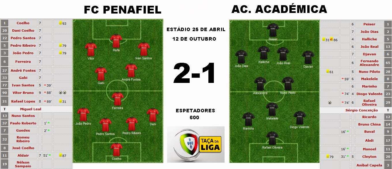 No jogo de ontem o Penafiel venceu a Académica por 2-1 e para já está em vantagem na eliminatória da 2.ª fase da taça da liga. Vitor Bruno foi o herói da partida marcando os dois golos penafidelenses em lances idênticos em que o extremo fez dois chapéus a Peiser. Os golos foram marcados nos primeiros 10 minutos, num início de partida muito bom de equipa de Miguel Leal. Ontem a equipa penafidelense tentou jogar à bola, tentou ter a bola em seu poder e deu resultado. Obviamente depois do 2-0 a Académica pressionou o FC Penafiel e depois de várias bolas paradas o golo da Briosa chegou aos 34 minutos. Na segunda parte a equipa penafidelense tentou segurar o resultado nunca esquecendo o ataque, mas o resultado final foi o 2-1.